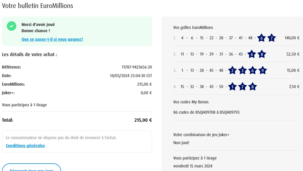 Pas de bulletin. Mises groupées pour la super cagnotte du 15/03/2024