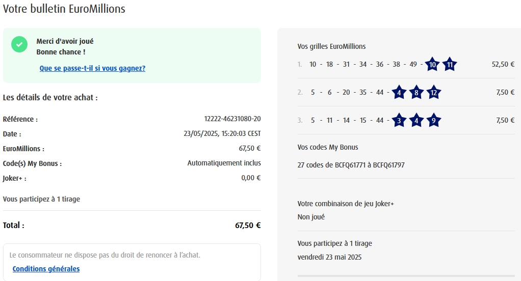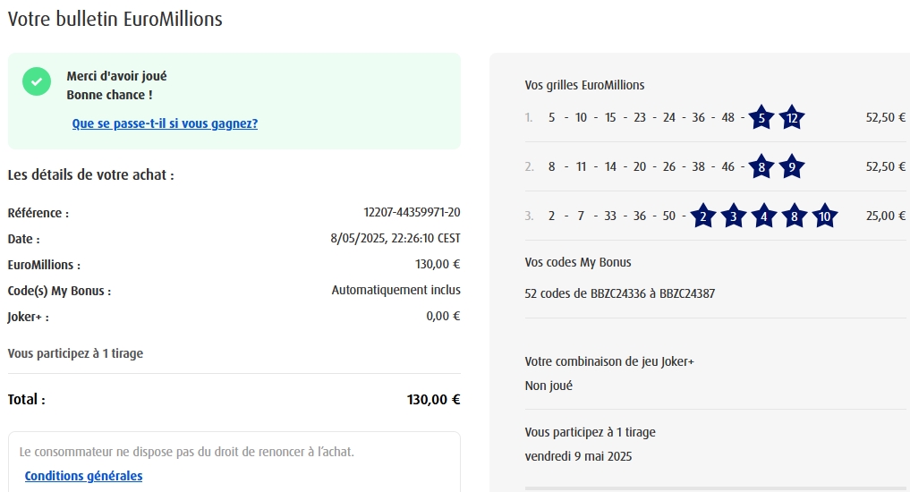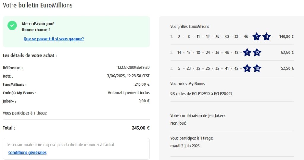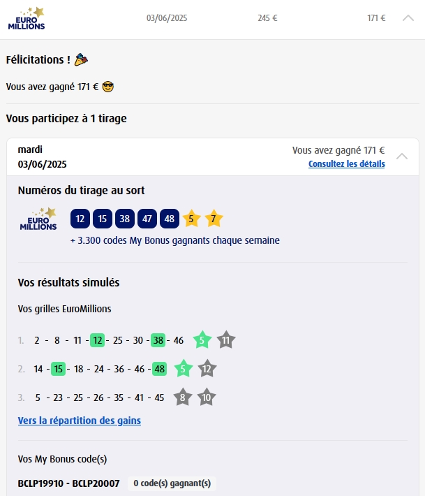 Categories Bulletin Tirage Bulletin du 03/06/2025 Post author By yves Post date 5 juin 2025 Gains: 171€