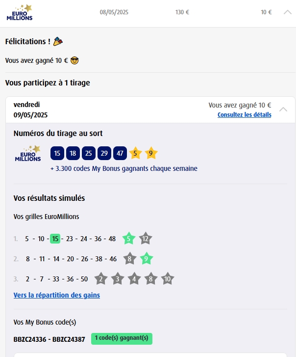 Categories Bulletin Tirage Bulletin du 09/05/2025 Post author By yves Post date 8 mai 2025 Gains: 10€