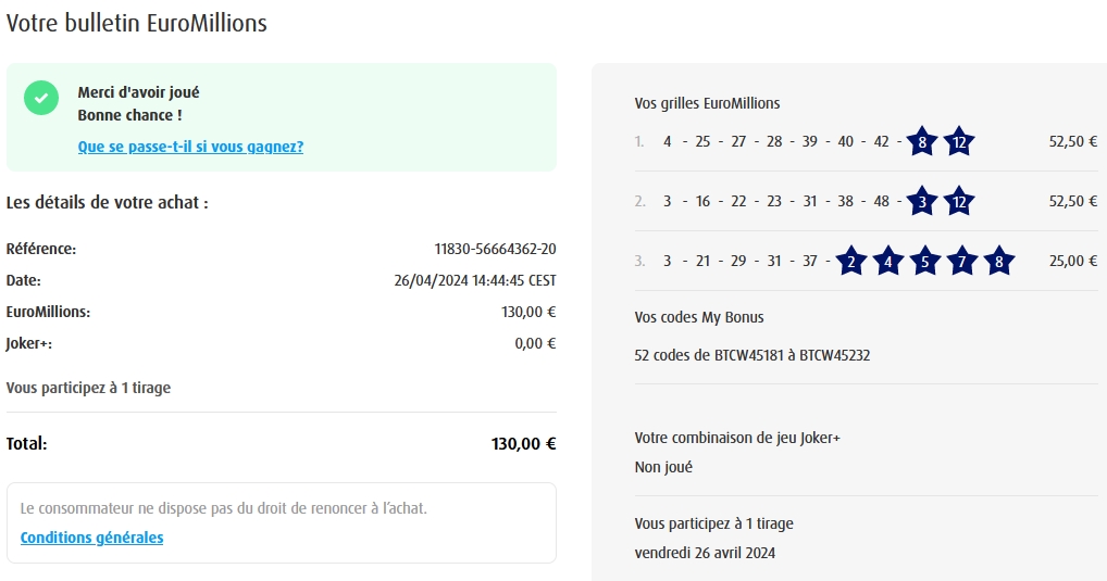 Categories Bulletin Tirage Bulletin du 26/04/2024 Post author By yves Post date 26 avril 2024 Gains: 62€