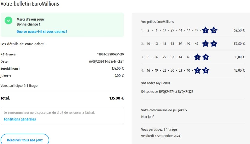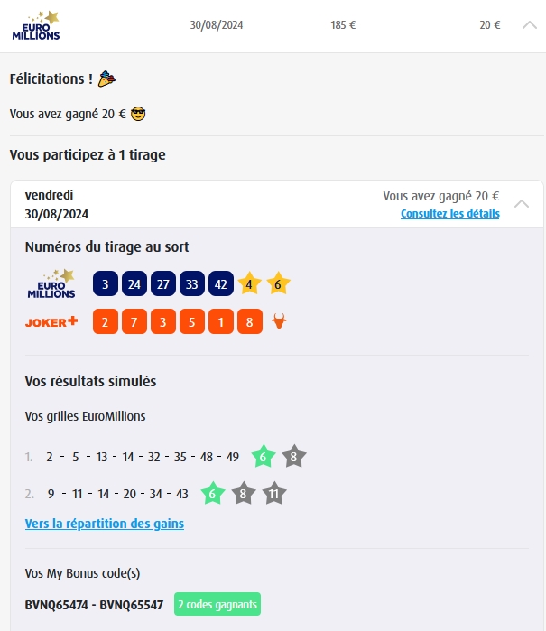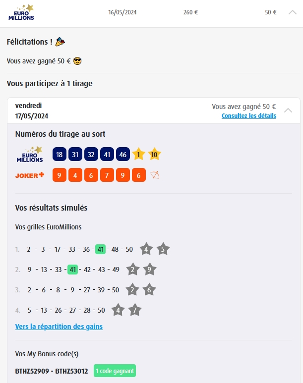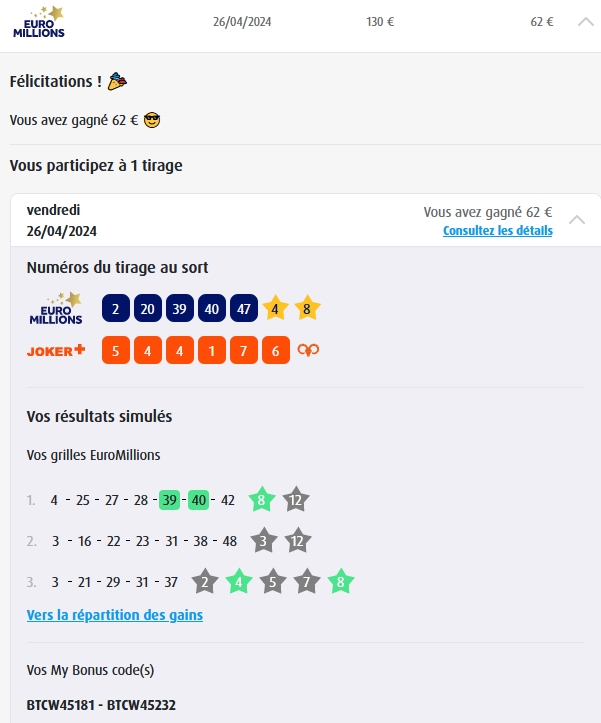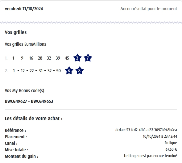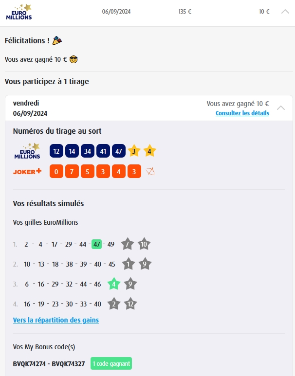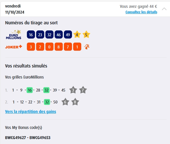 Categories Bulletin Tirage Bulletin du 11/10/2024 Post author By yves Post date 10 octobre 2024 Gains: 44€