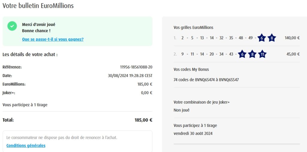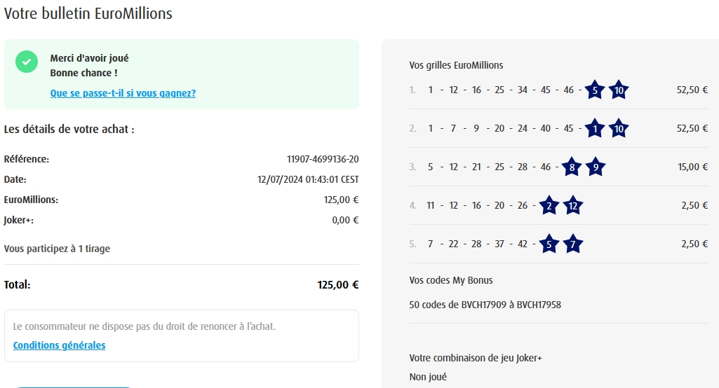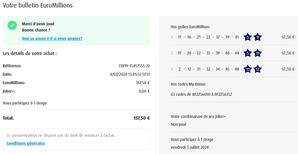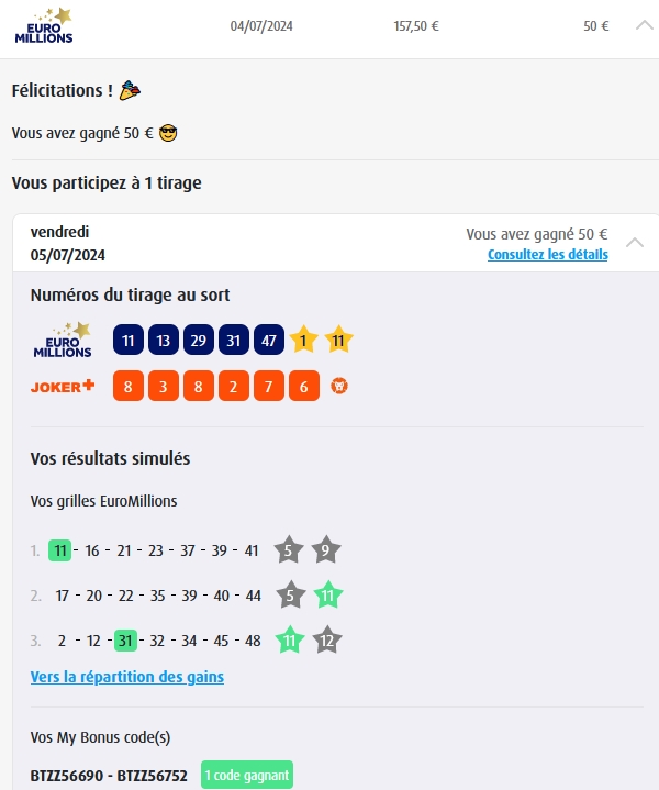 Categories Bulletin Tirage Bulletin du 04/07/2024 Post author By yves Post date 4 juillet 2024 Gains: 50€
