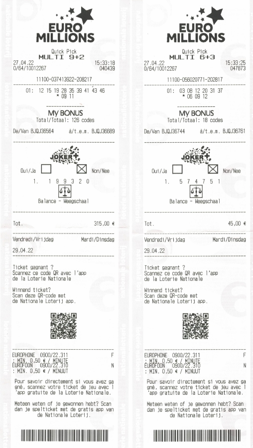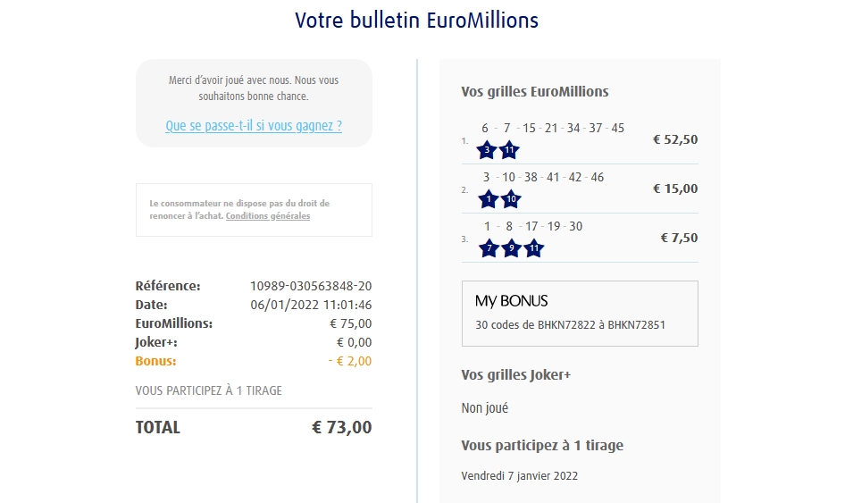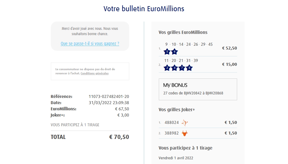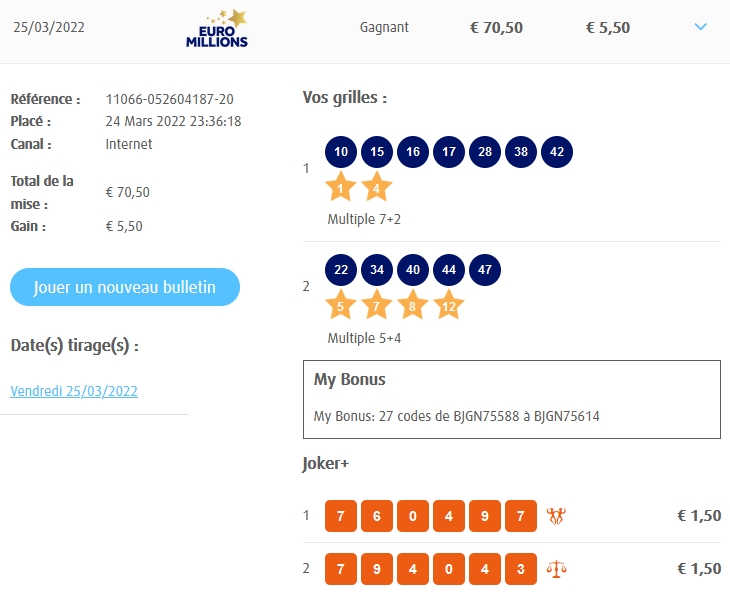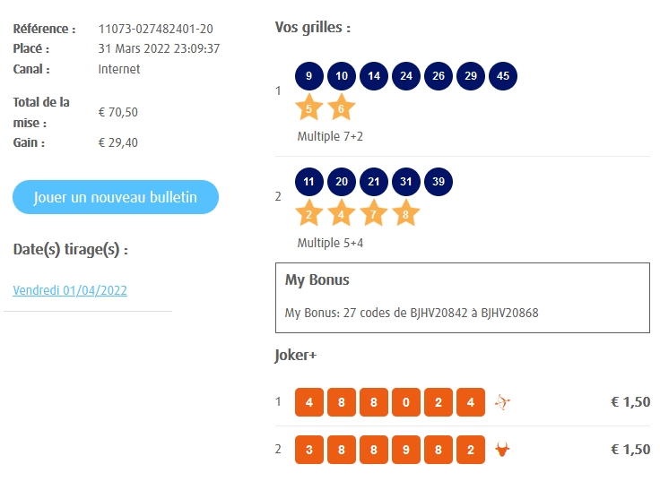 Categories Bulletin Tirage Bulletin du 01/04/2022 Post author By yves Post date 31 mars 2022 Gains: 29,40€