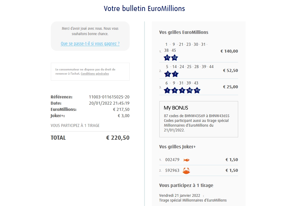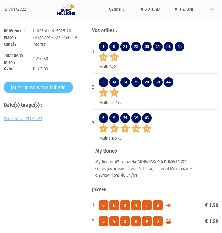 Categories Bulletin Tirage Bulletin du 21/01/2022 Post author By yves Post date 20 janvier 2022 Gains: 163€