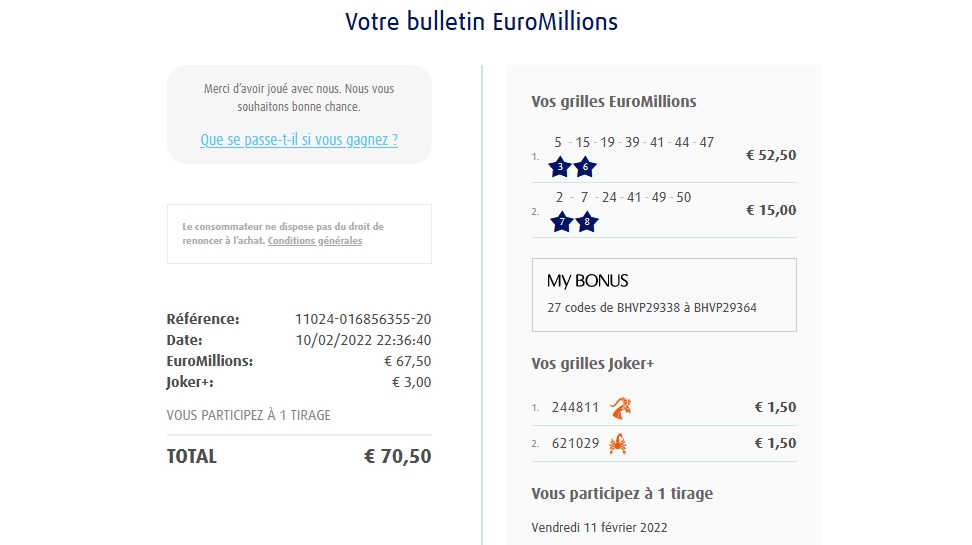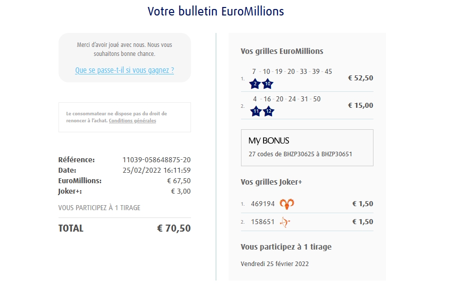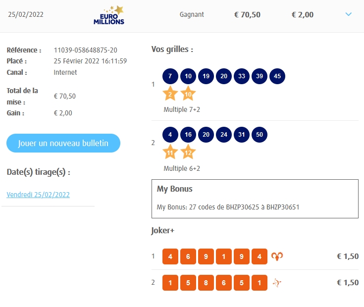 Categories Bulletin Tirage Bulletin du 25/02/2022 Post author By yves Post date 25 février 2022 Gains: 2€