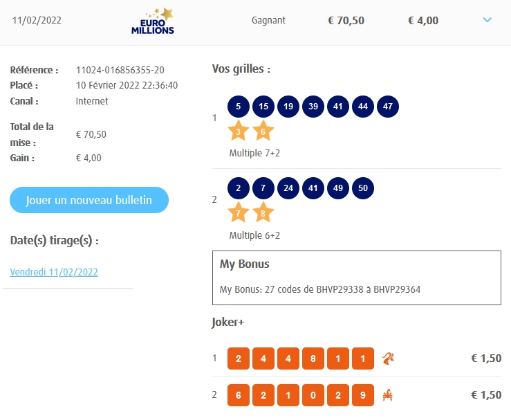 Categories Bulletin Tirage Bulletin du 11/02/2022 Post author By yves Post date 10 février 2022 Gains: 4€
