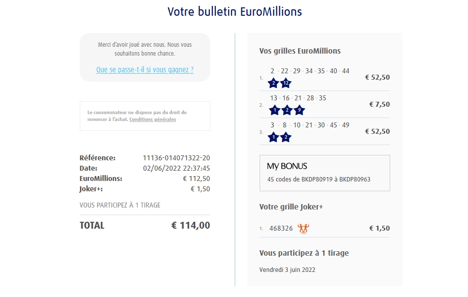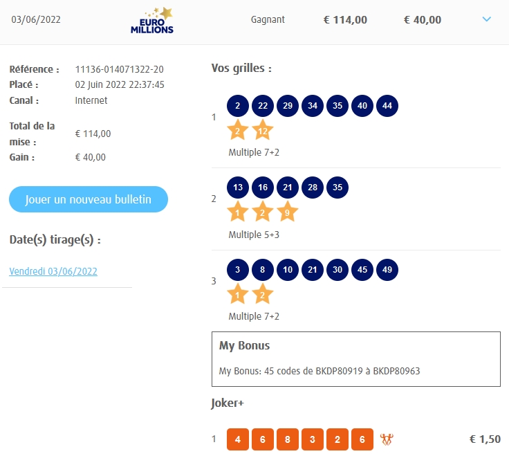 Categories Bulletin Tirage Bulletin du 03/06/2022 Post author By yves Post date 2 juin 2022 Gains: 40€
