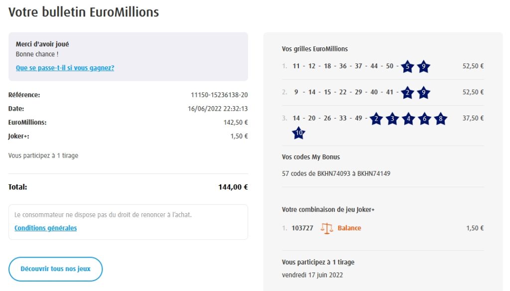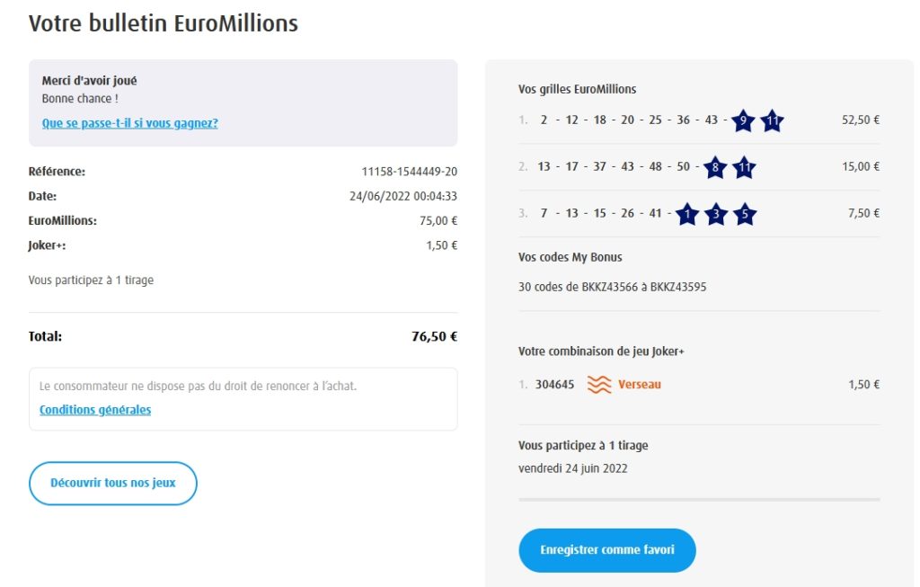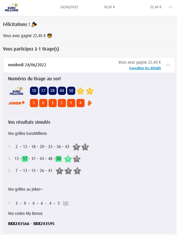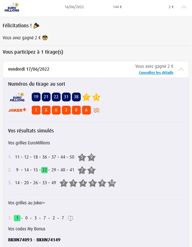 Categories Bulletin Tirage Bulletin du 24/06/2022 Post author By yves Post date 24 juin 2022 Gains: 22,40€
