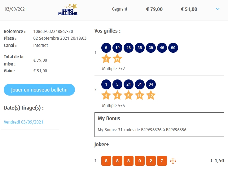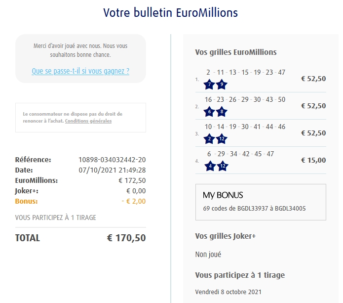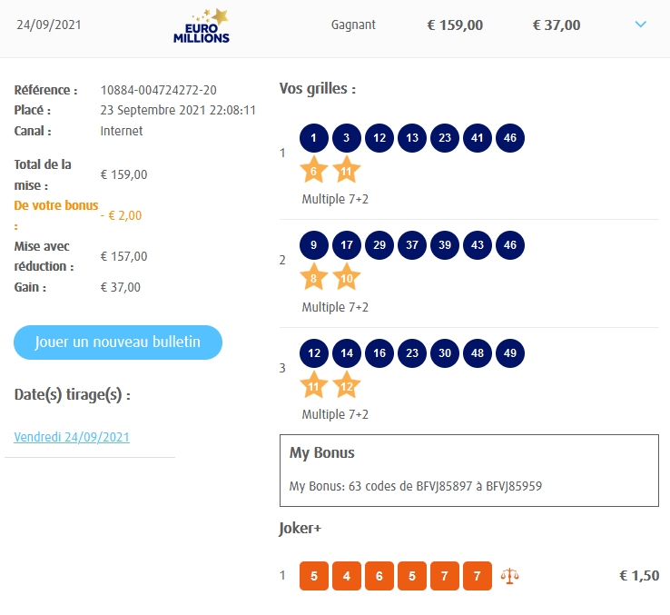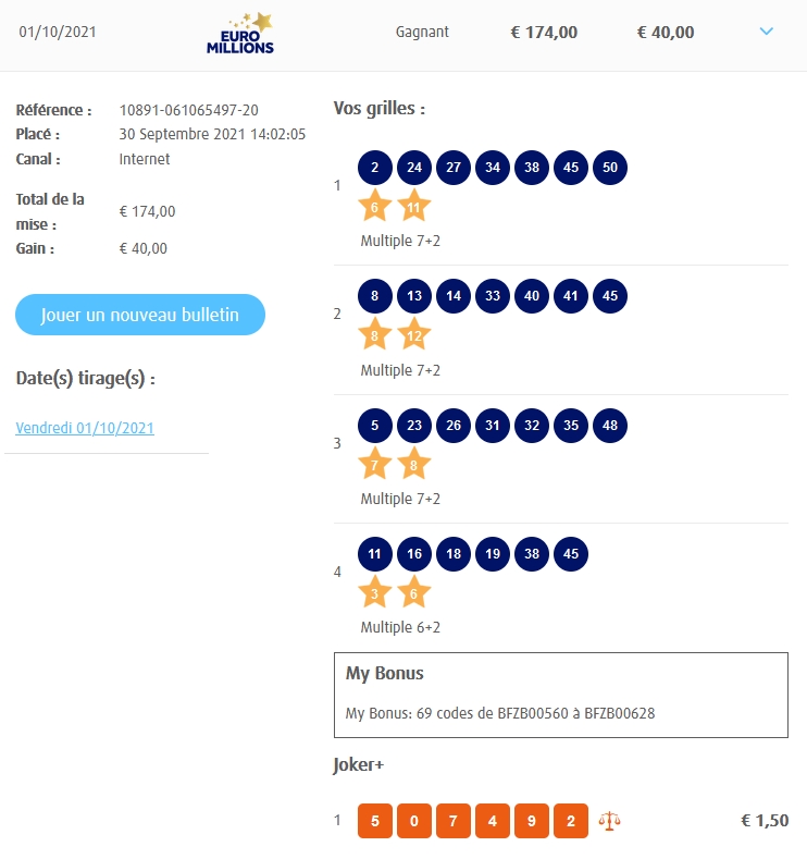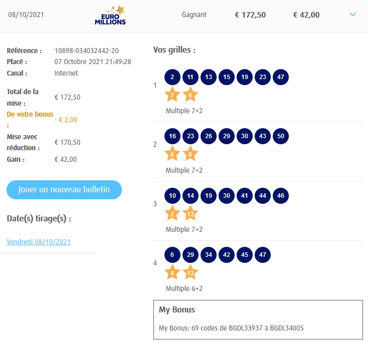 Categories Bulletin Tirage Bulletin du 08/10/2021 Post author By yves Post date 7 octobre 2021 Gains: 42€