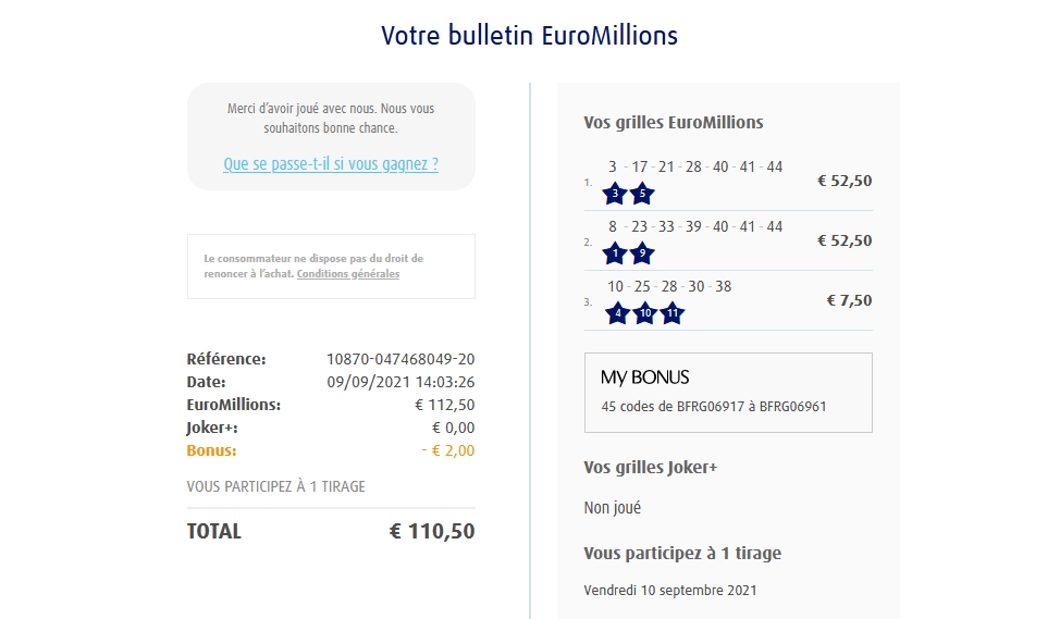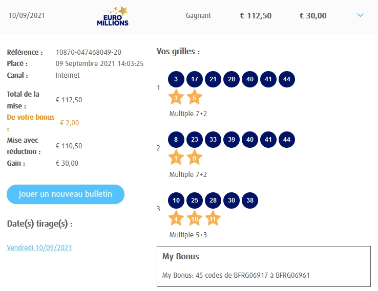Categories Bulletin Tirage Bulletin du 10/09/2021 Post author By yves Post date 9 septembre 2021 Gains: 30€