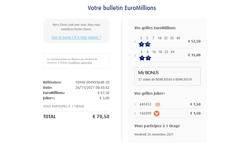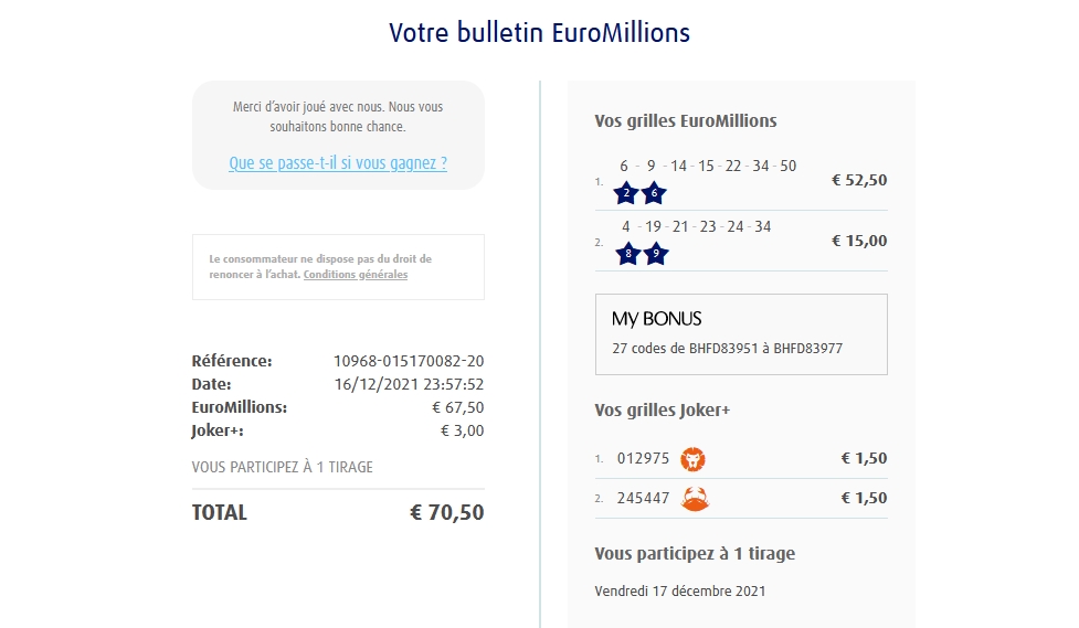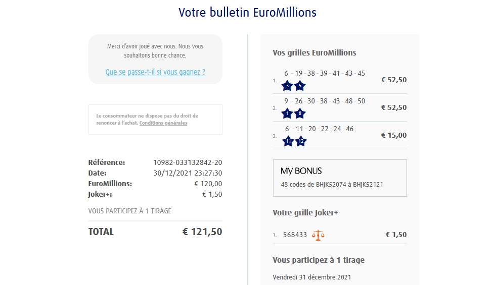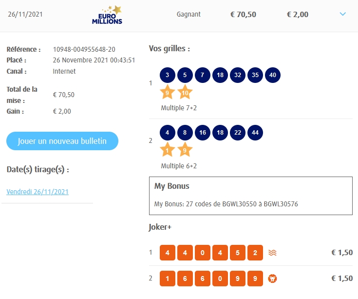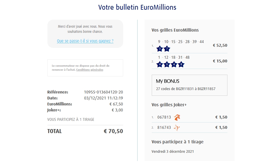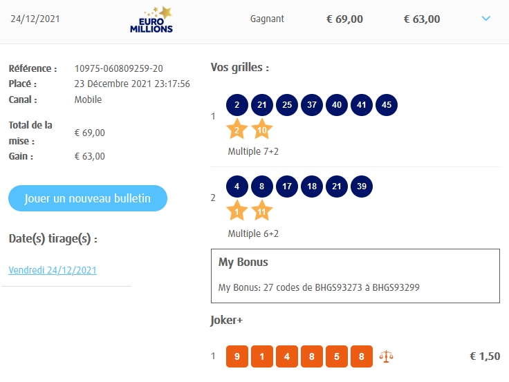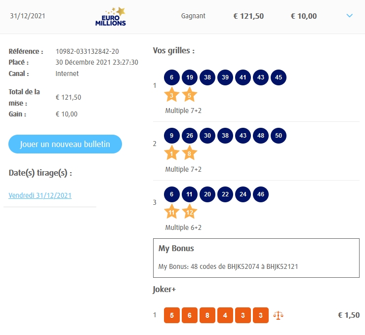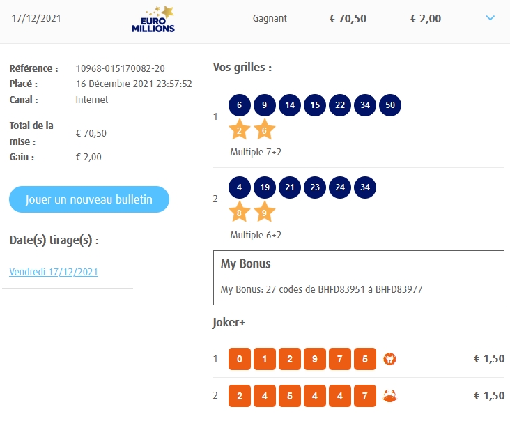 Categories Bulletin Tirage Bulletin du 03/12/2021 Post author By yves Post date 3 décembre 2021 Gains: 7€