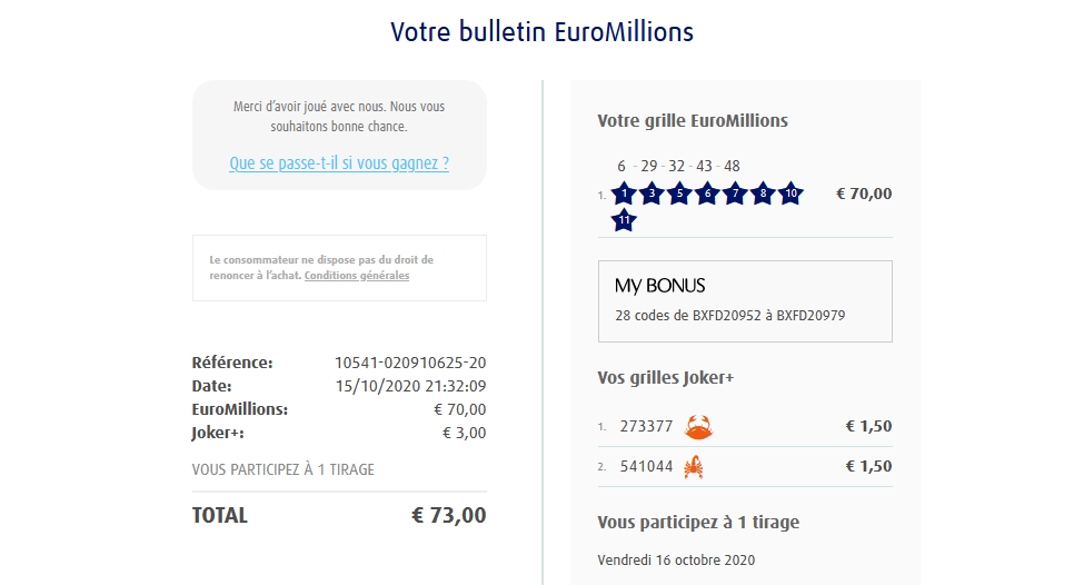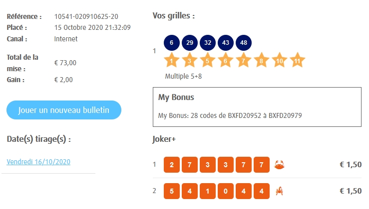 Categories Bulletin Tirage Bulletin du 16/10/2020 Post author By yves Post date 15 octobre 2020 Gains: 2€