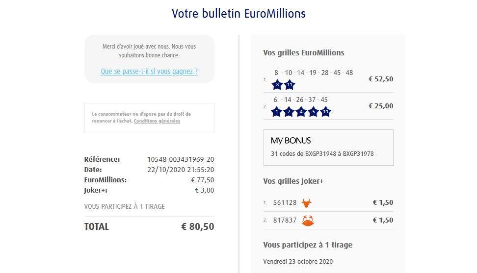 Categories Bulletin Tirage Bulletin du 23/10/2020 Post author By yves Post date 22 octobre 2020 Gains: 32€