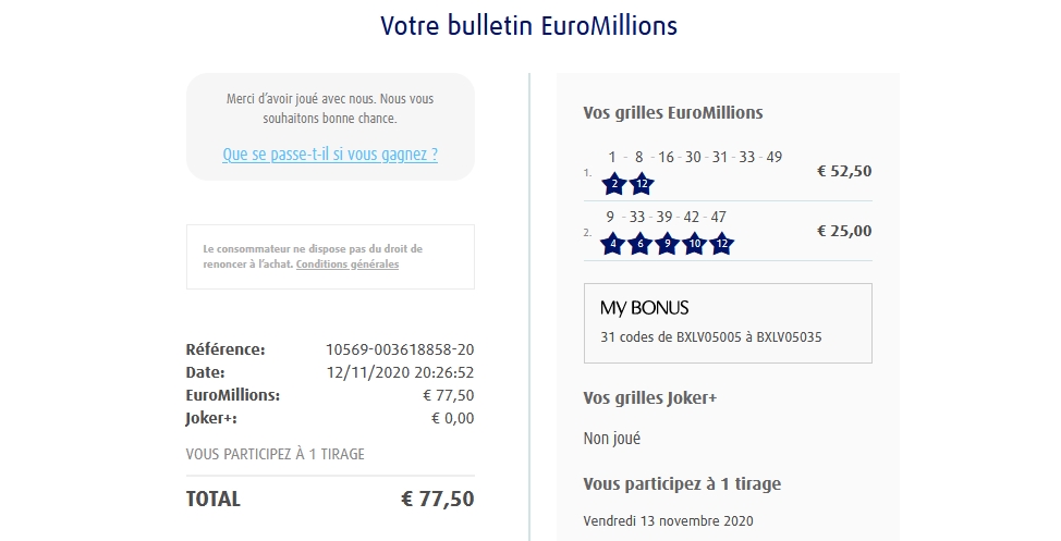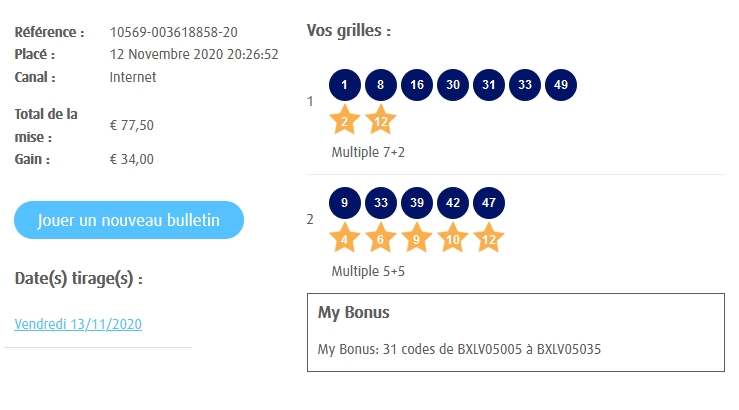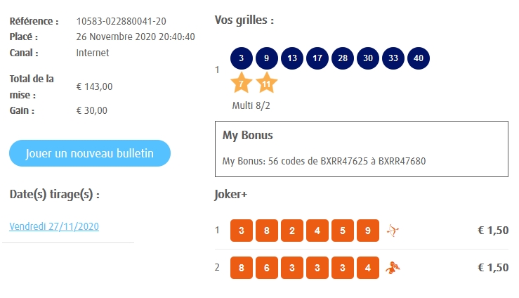 Categories Bulletin Tirage Bulletin du 13/11/2020 Post author By yves Post date 12 novembre 2020 Gains: 34€