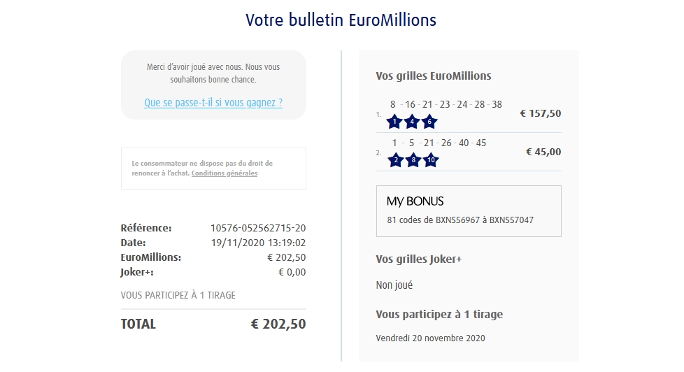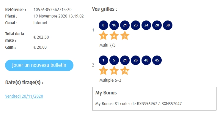 Categories Bulletin Tirage Bulletin du 20/11/2020 Post author By yves Post date 20 novembre 2020 Gains: 20€