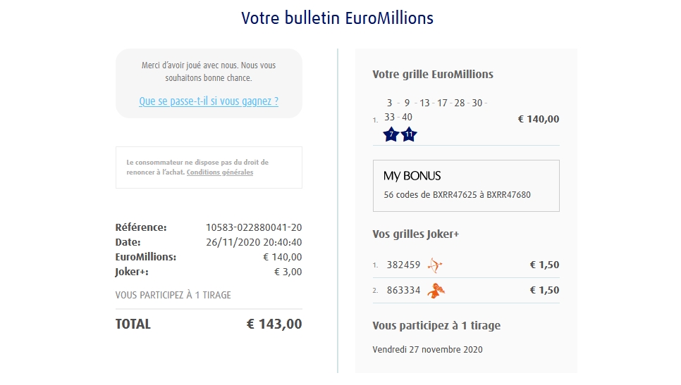Categories Bulletin Tirage Bulletin du 26/11/2020 Post author By yves Post date 26 novembre 2020 Gains: 30€