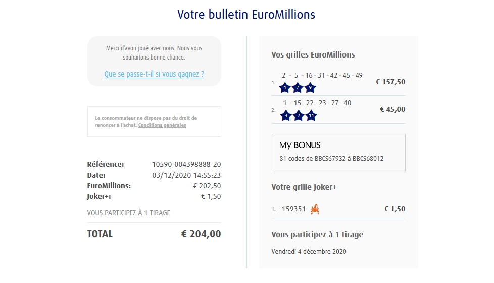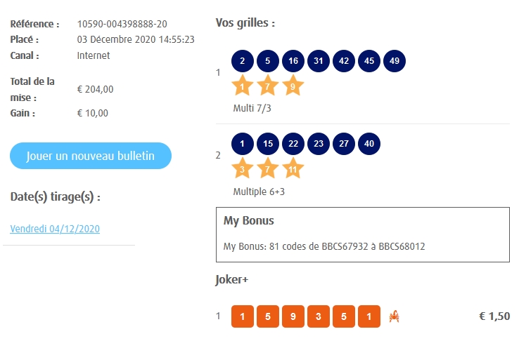 Categories Bulletin Tirage Bulletin du 04/12/2020 Post author By yves Post date 3 décembre 2020 Gains: 10€