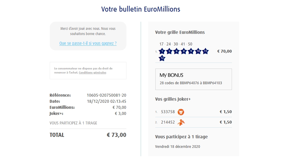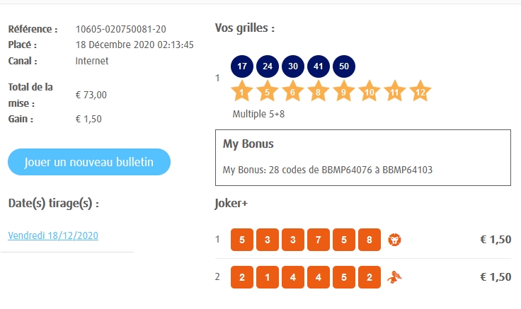 Categories Bulletin Tirage Bulletin du 18/12/2020 Post author By yves Post date 18 décembre 2020 Gains: 1,50€