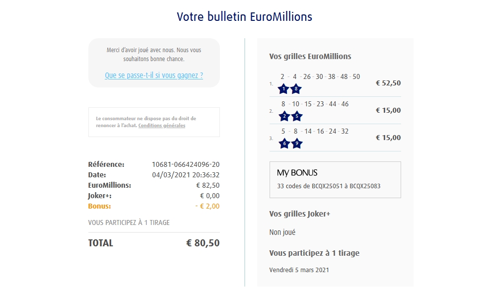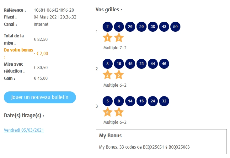 Categories Bulletin Tirage Bulletin du 05/03/2021 Post author By yves Post date 4 mars 2021 Gains: 45€