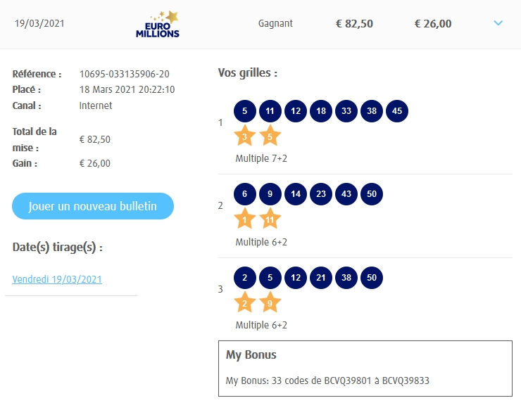 Categories Bulletin Tirage Bulletin du 19/03/2021 Post author By yves Post date 18 mars 2021 Gains: 26€